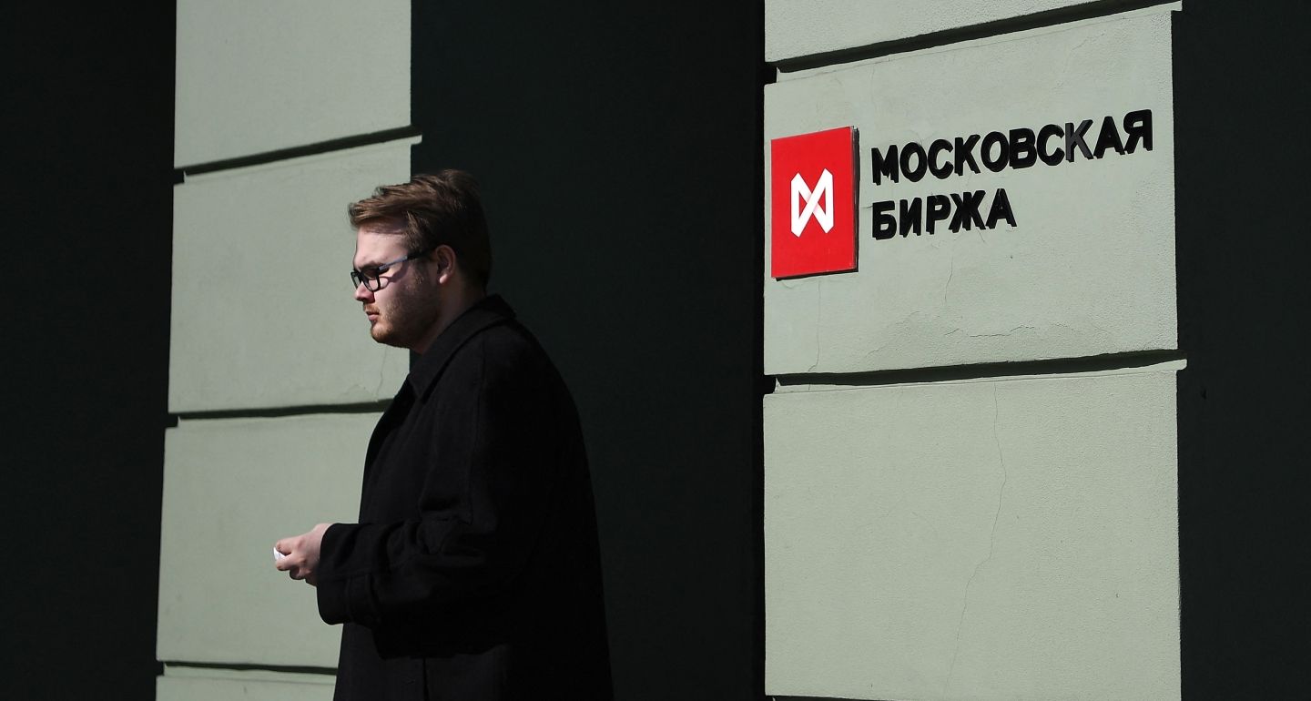 Мужина выходит из здания офиса Московской биржи в Москве, 24 марта 2022 года. Фото: Getty Images