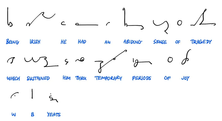Некоторое время назад системы Грегга и Питмана в UK уступили место вышеупомянутой Teeline (пример на следующей картинке). Для прохождения аккредитации NCTJ журналисты до сих пор должны учиться этому методу стенографии и писать от 60 слов в минуту, а в норме — и все 100: