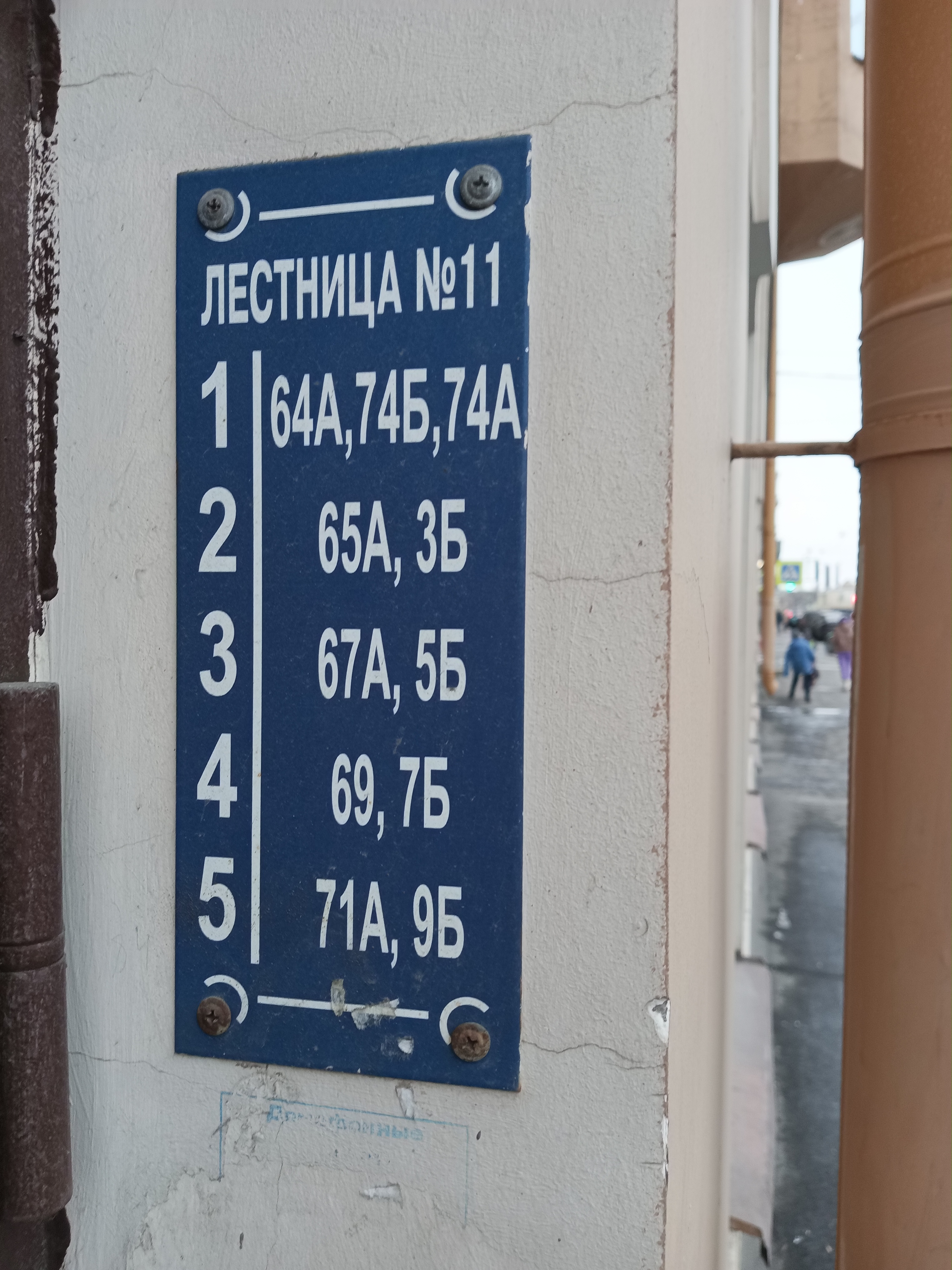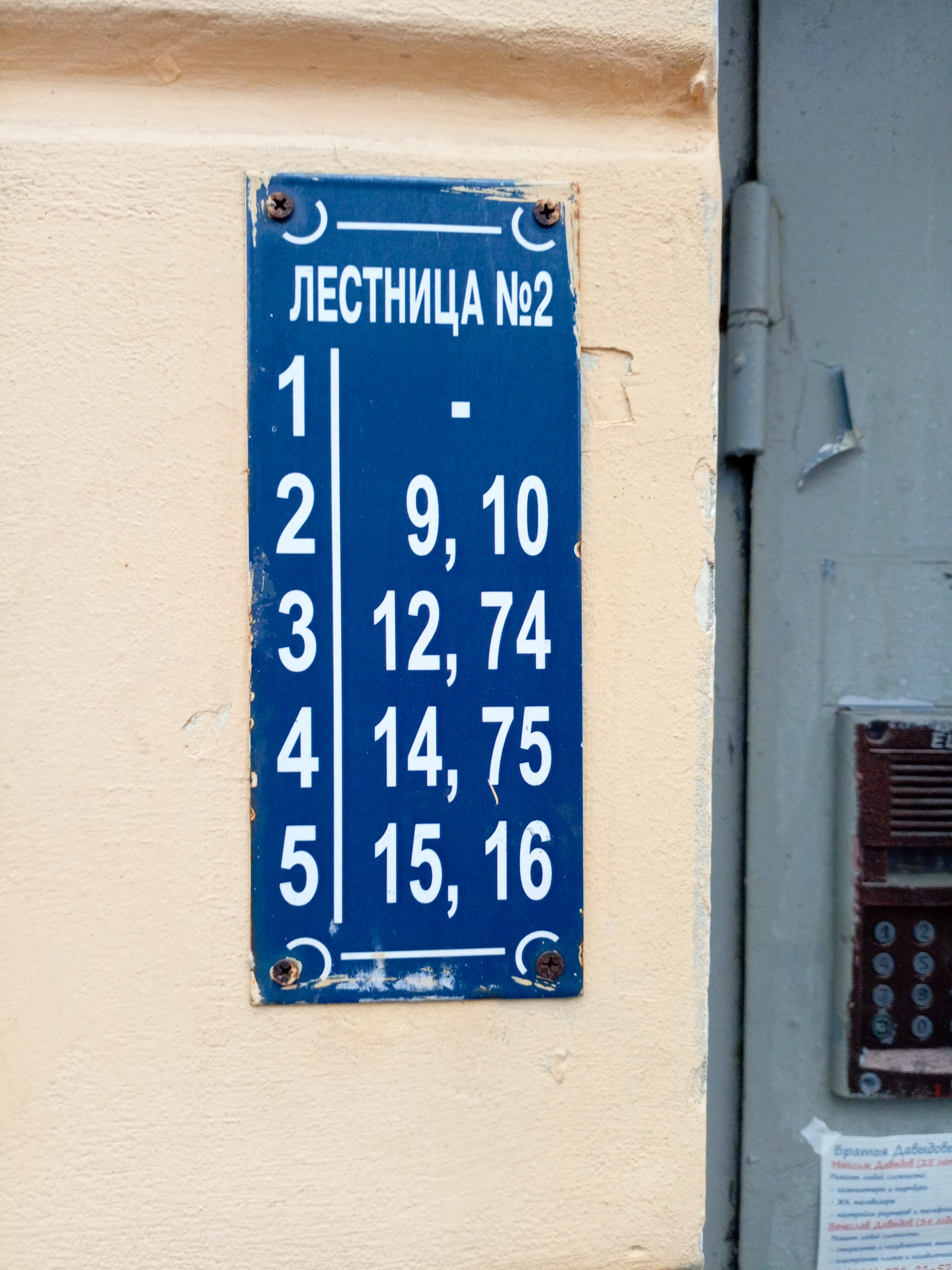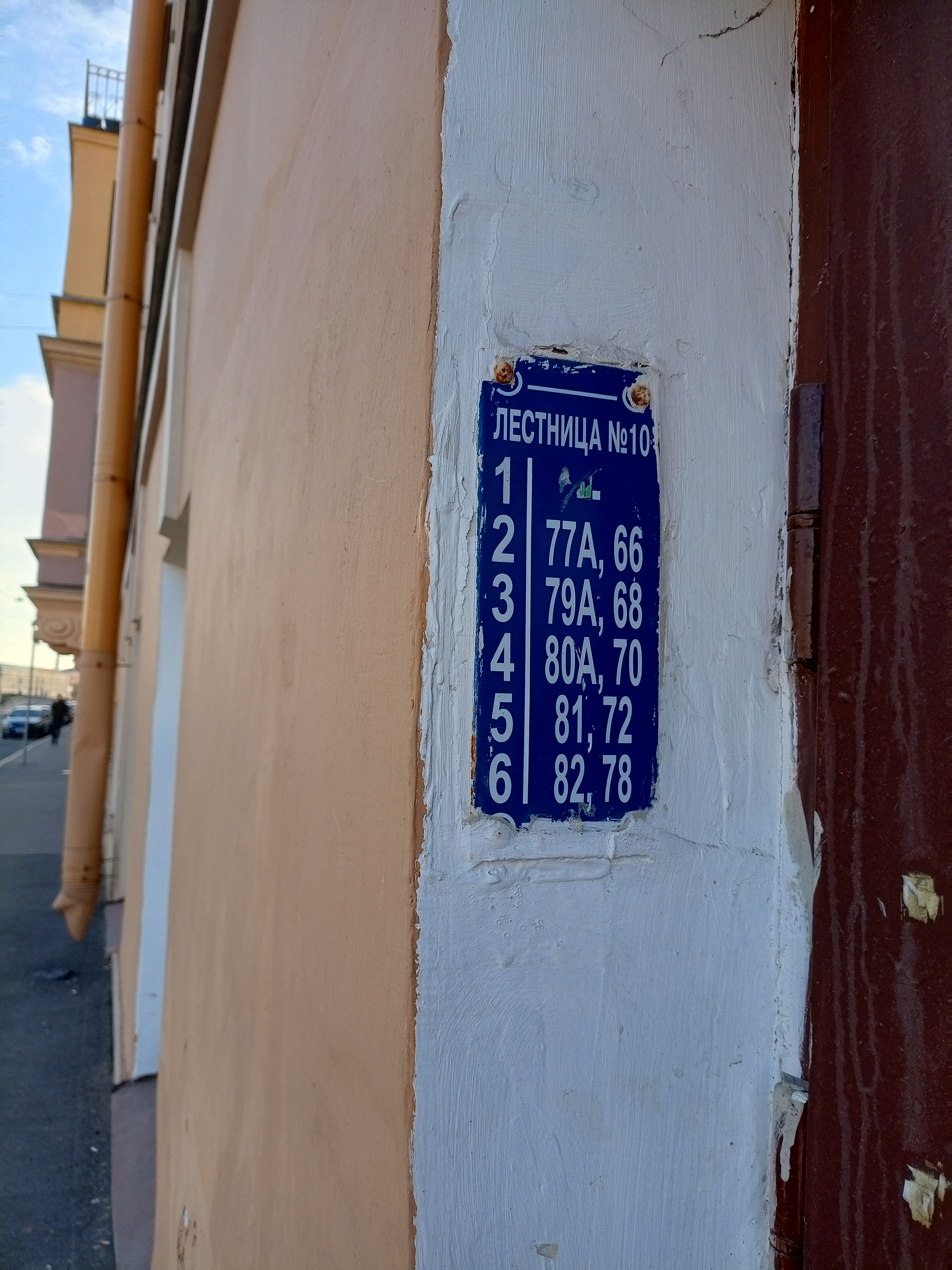 В Питере всё совсем не так. Нумерация квартир не поддаётся никакой логике, просто идти вдоль дома, в направлении увеличения номеров помещений — бесперспективно. Нумерация не монотонно увеличивается ни с номером подъезда, ни с номером этажа. А квартира, кстати, может находиться в нескольких подъездах одновременно (и на нескольких этажах). Принёс вам несколько фоточек адресных табличек.