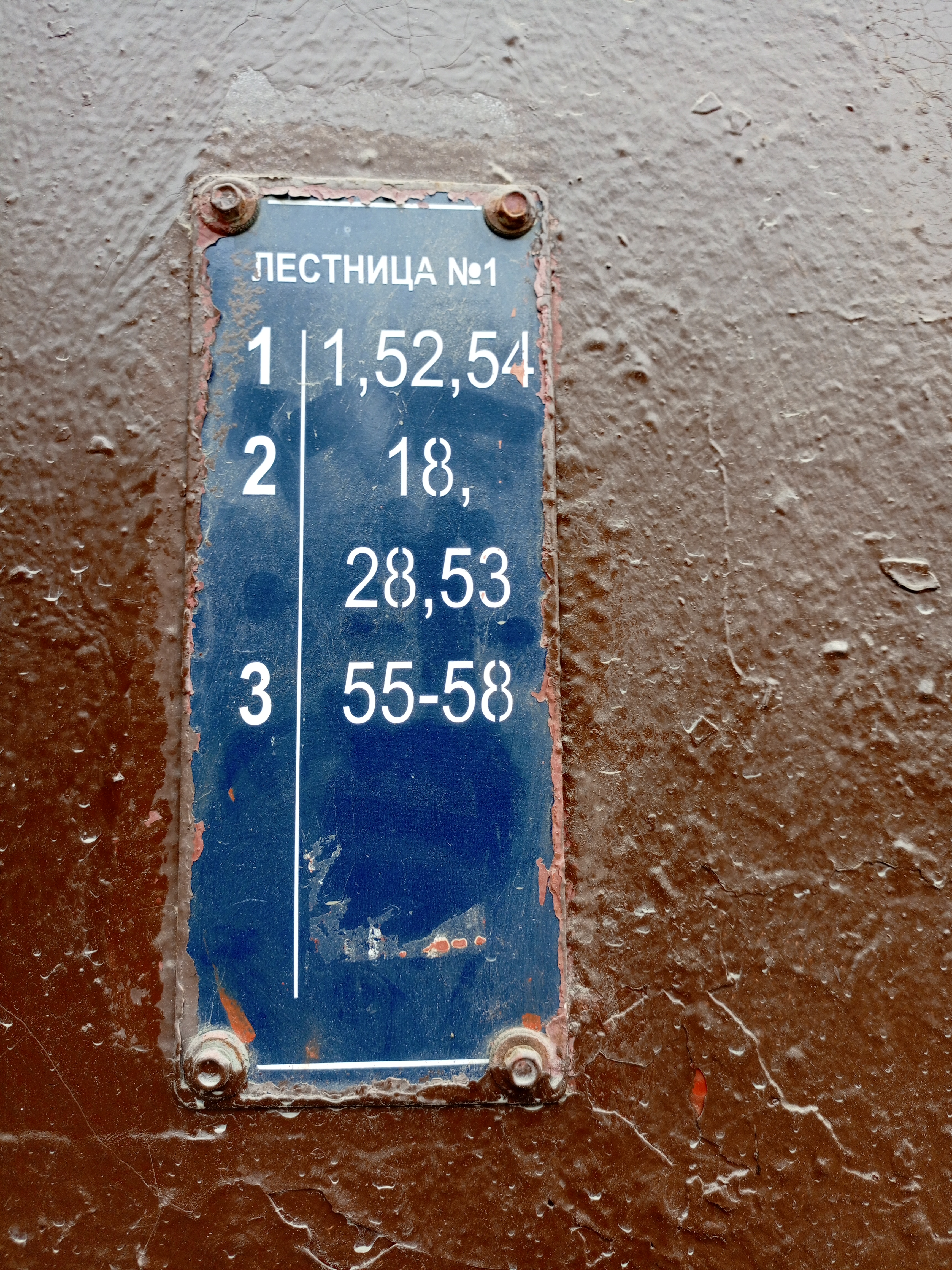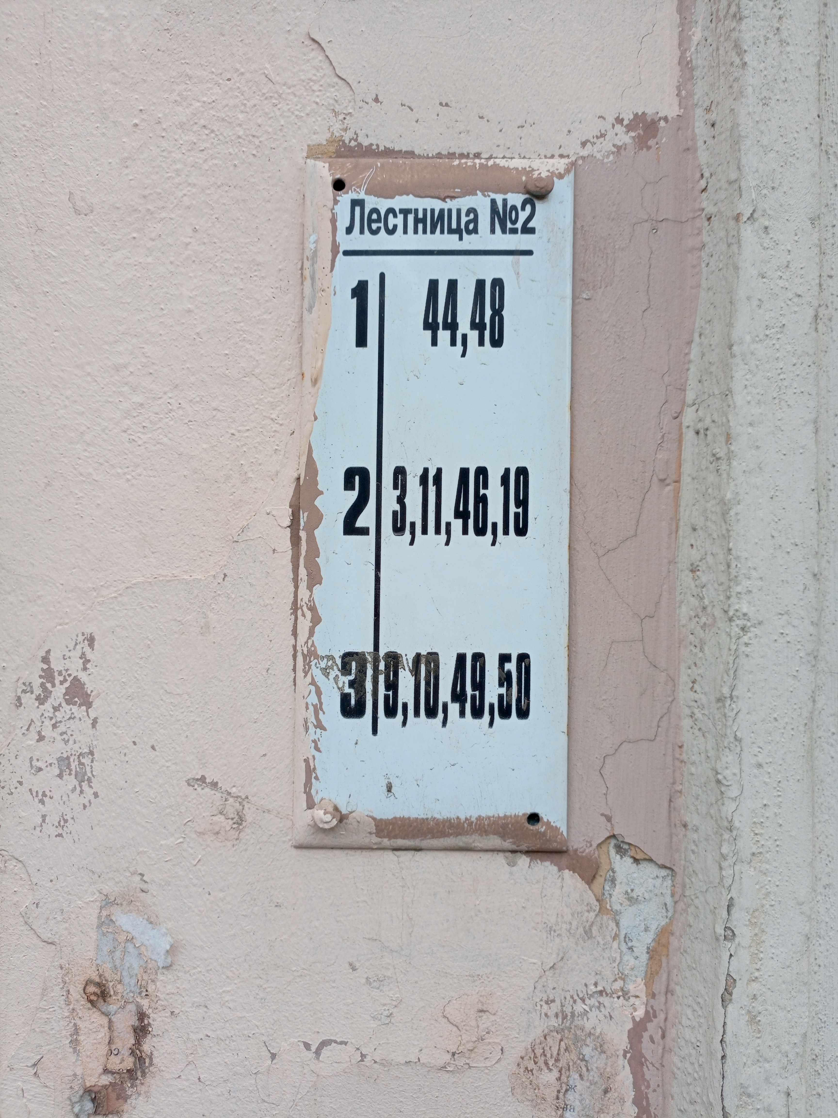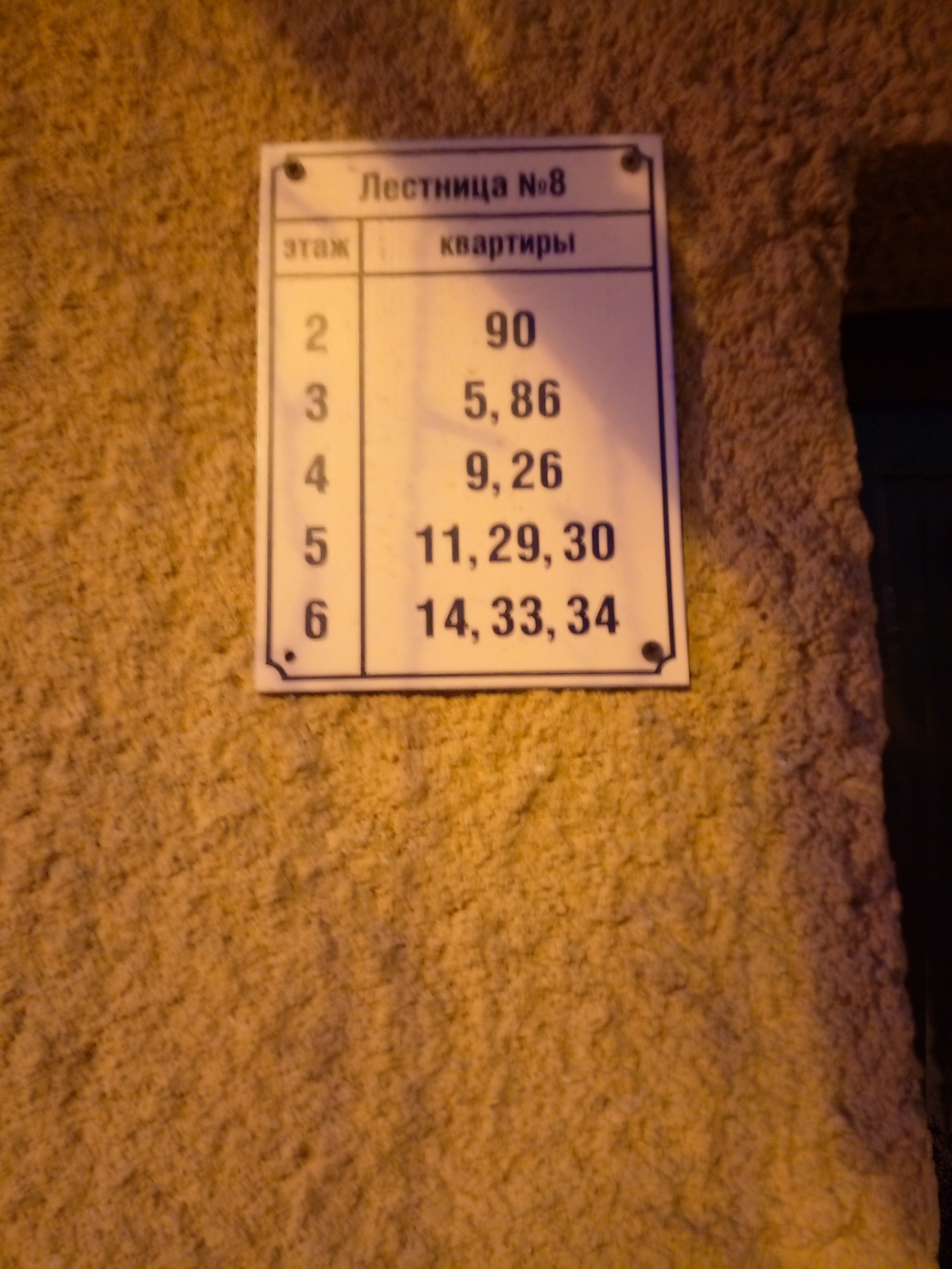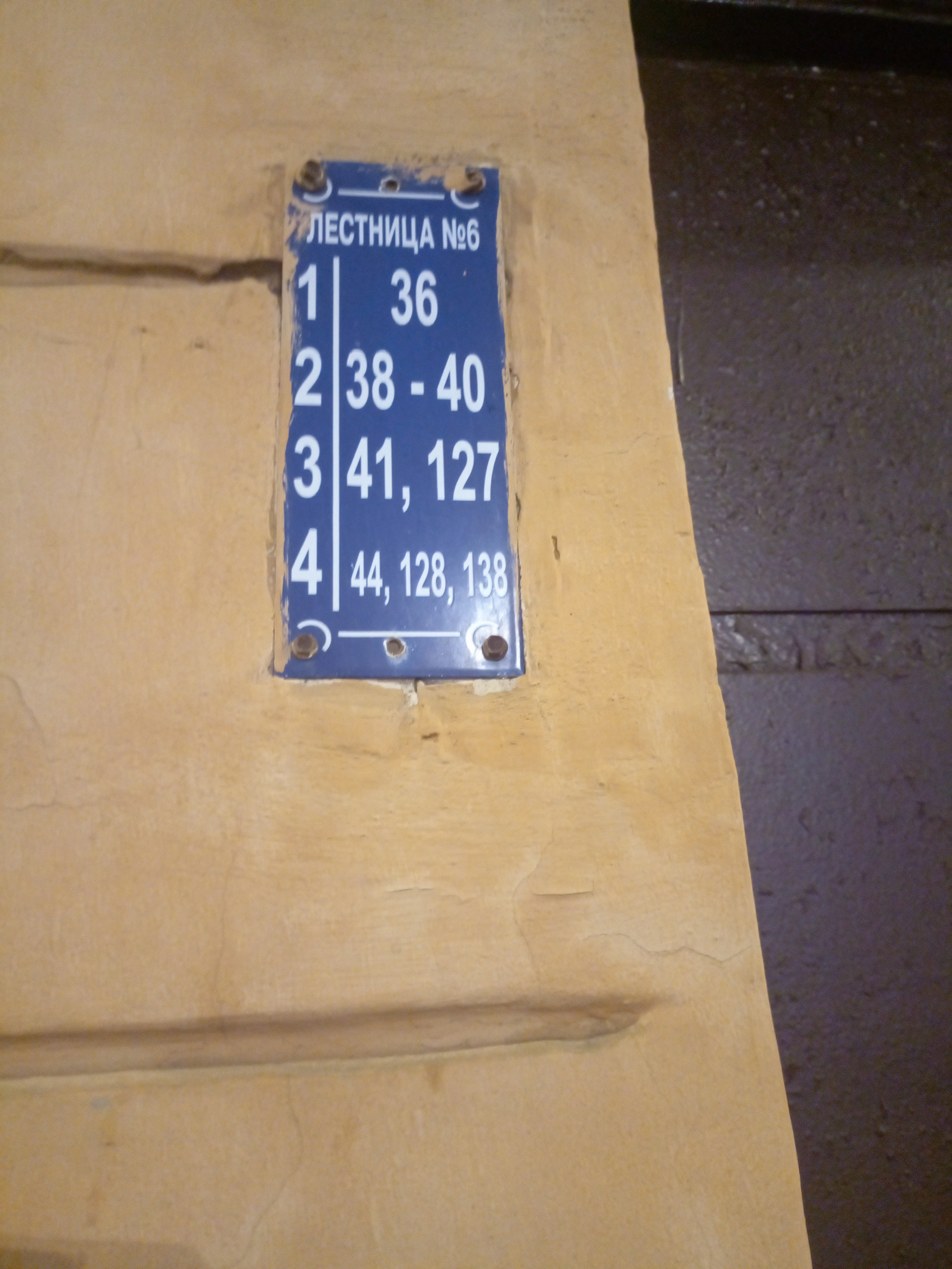 В Питере всё совсем не так. Нумерация квартир не поддаётся никакой логике, просто идти вдоль дома, в направлении увеличения номеров помещений — бесперспективно. Нумерация не монотонно увеличивается ни с номером подъезда, ни с номером этажа. А квартира, кстати, может находиться в нескольких подъездах одновременно (и на нескольких этажах). Принёс вам несколько фоточек адресных табличек.