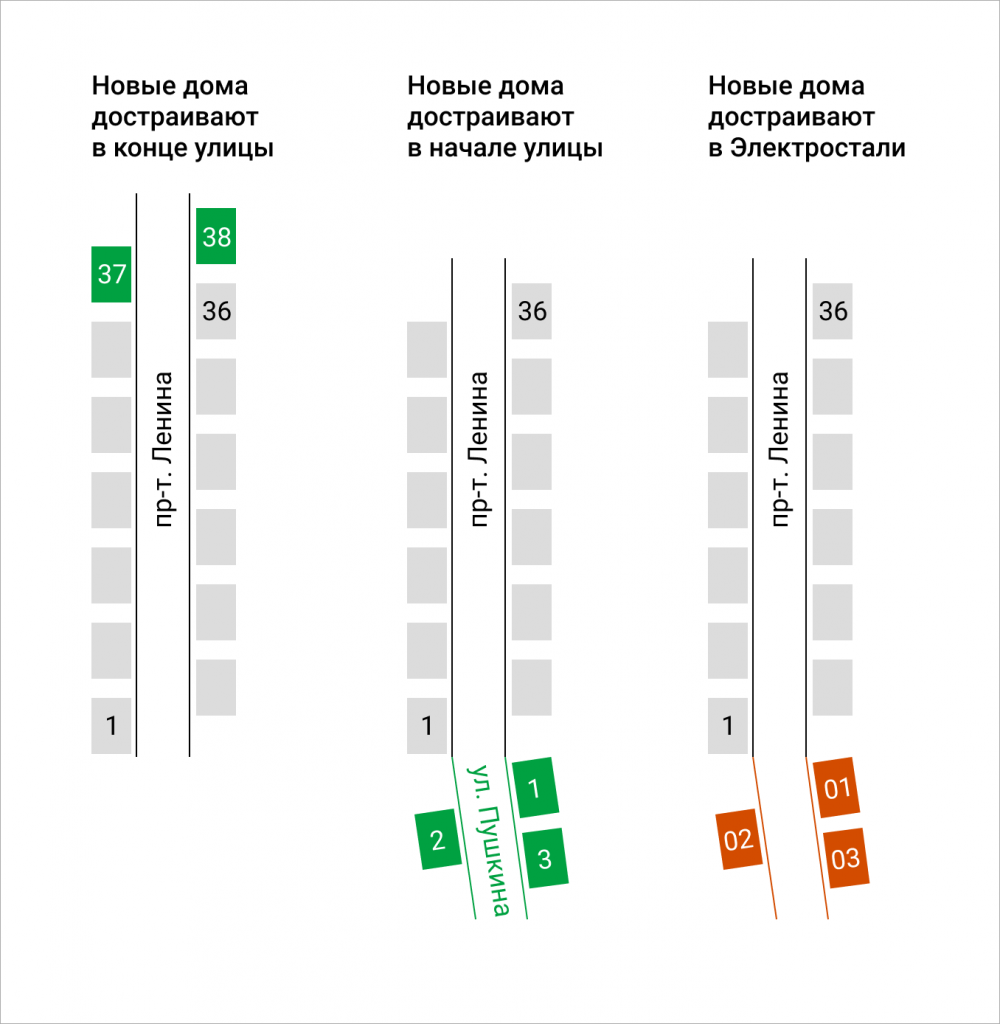 Но для начала давайте простой московский кейс. Есть дом, в нём два корпуса, на 100 квартир каждый. Будет ли нумерация квартир во втором корпусе начинаться с 1 или со 101? А нумерация подъездов будет начинаться с 1, или, может, с 6? Правильно, бывает и так, и так, и так (и это всё дома неподалёку друг от друга).